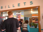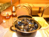 | 右はすっきりした味わいのベルギービール&ムール貝のワイン蒸し、フライドポテト添えです。洗面器ほどの大きさの鍋にジュウジュウトと運ばれてきて、まいう〜!ボウイさんにベルギーワッフルも奨められたけど、これだけでもう腹いっぱい。→ | ![]() |